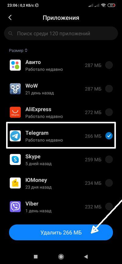 - выбираем Телеграм и жмем кнопку «Удалить», а затем подтверждаем процедуру.