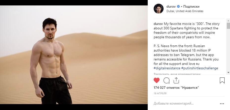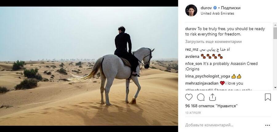 В тот же день, когда было вынесено решение о запрете Телеграм на территории РФ, Павел Дуров пополнил Инстаграм своей фотографией на белом коне посреди пустыни в ОАЭ.