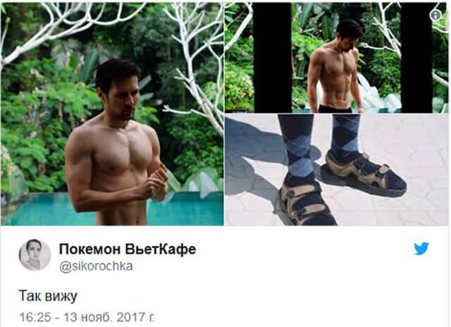 Из этого же фотосета интернет-сообщество выбрало еще одну фоточку для мемов. На ней все тот же Дуров, но уже без футболки и без коня.