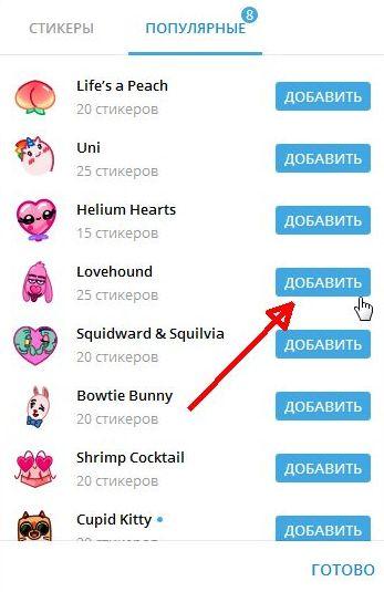 • выбрать стикерпак, который понравится больше всего, и нажать на кнопку «Добавить».