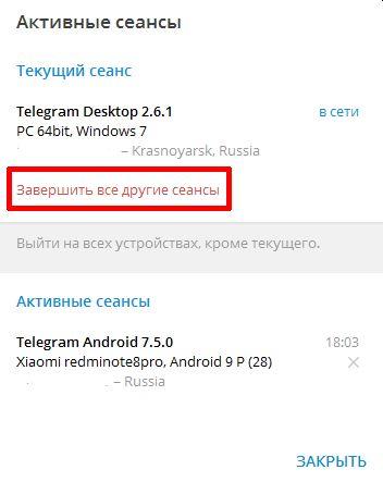 Выполнив соответствующие настройки, пользователь может также удалить все сессии на других девайсах, что актуально в случаях, когда пришлось общаться в мессенджере с чужого телефона или ПК.